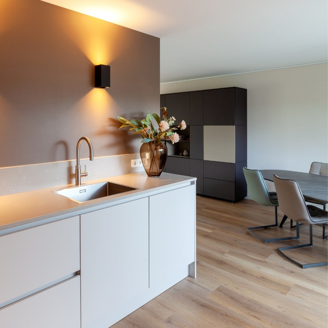 - Accenten: Chroomkleurige Quooker voor direct kokend water, zwarte wandspotjes voor sfeervolle verlichting