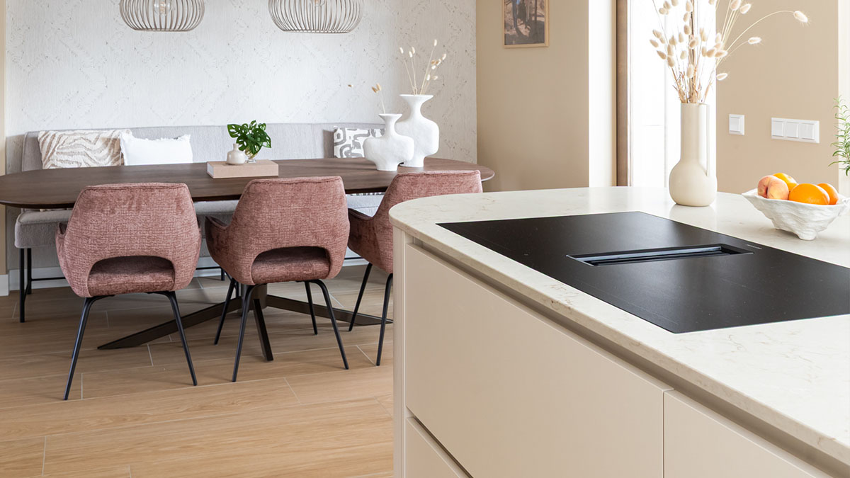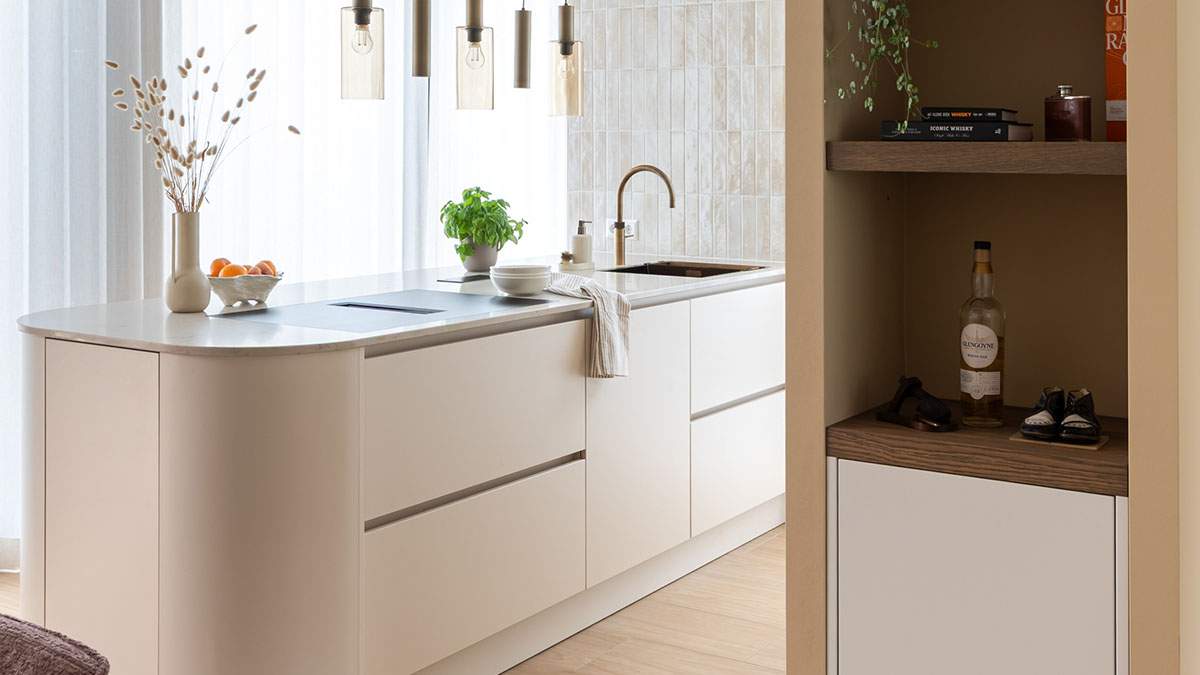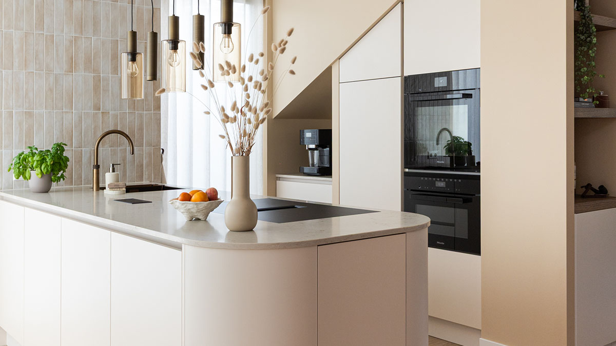 Wat direct opvalt, is de zachte uitstraling van het ontwerp. Ronde vormen doorbreken de rechte lijnen en geven de keuken een vriendelijk karakter. De keuze voor tegels op de achterwand voegt een subtiele structuur toe aan de ruimte. Deze combinatie van texturen zorgt voor diepgang, zonder dat het druk oogt. Het resultaat is een keuken die ruimtelijk aanvoelt en rust uitstraalt.