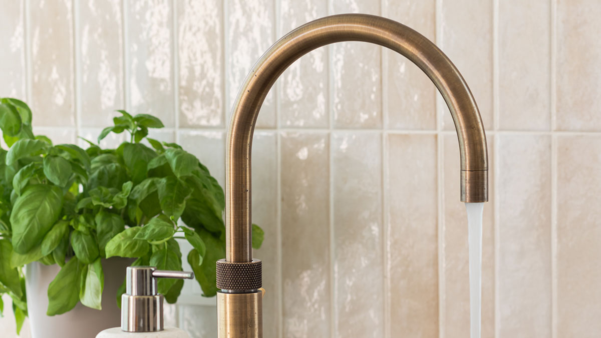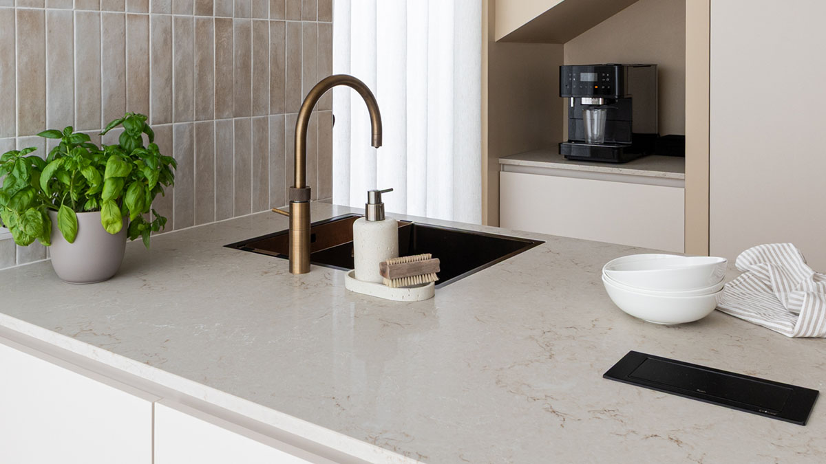 De materiaalkeuze tilt het ontwerp naar een hoger niveau. Messing details, zoals de Quooker kraan, fungeren als de sieraden van de keuken. Ze steken fraai af tegen de matte, beige fronten en geven het geheel een chique touch. Door te werken met hoogwaardige materialen die mooi op elkaar aansluiten, ontstaat er een warme en uitnodigende setting.