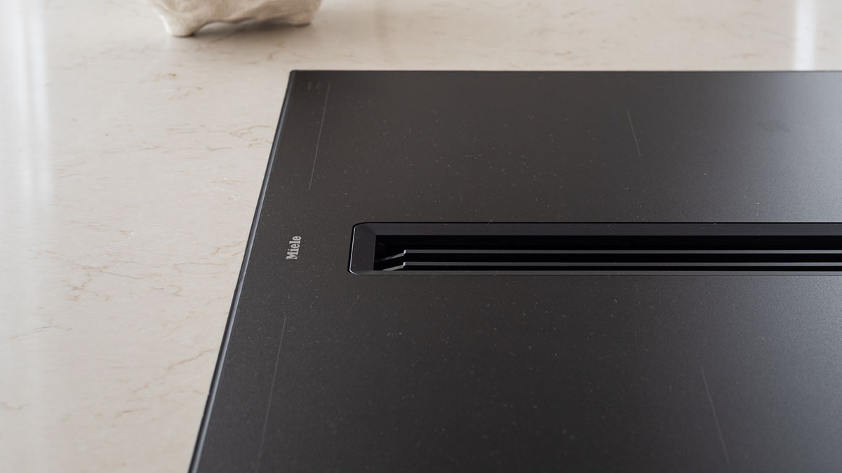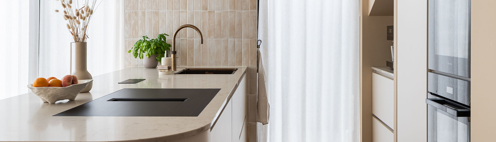Moderne apparatuur ondersteunt het minimalistische karakter van de keuken. De matzwarte kookplaat van Miele beschikt over werkbladafzuiging. Hierdoor blijft het zicht vrij van een afzuigkap en loopt het werkblad strak door. De kookplaat blendt mooi in het geheel. Samen met de twee Miele ovens beschikt de klant over alle tools om uitgebreid te koken, zonder in te leveren op een stijlvol ontwerp. De messing Quooker is een blikvanger en zorgt ervoor dat elke bereiding soepel verloopt.