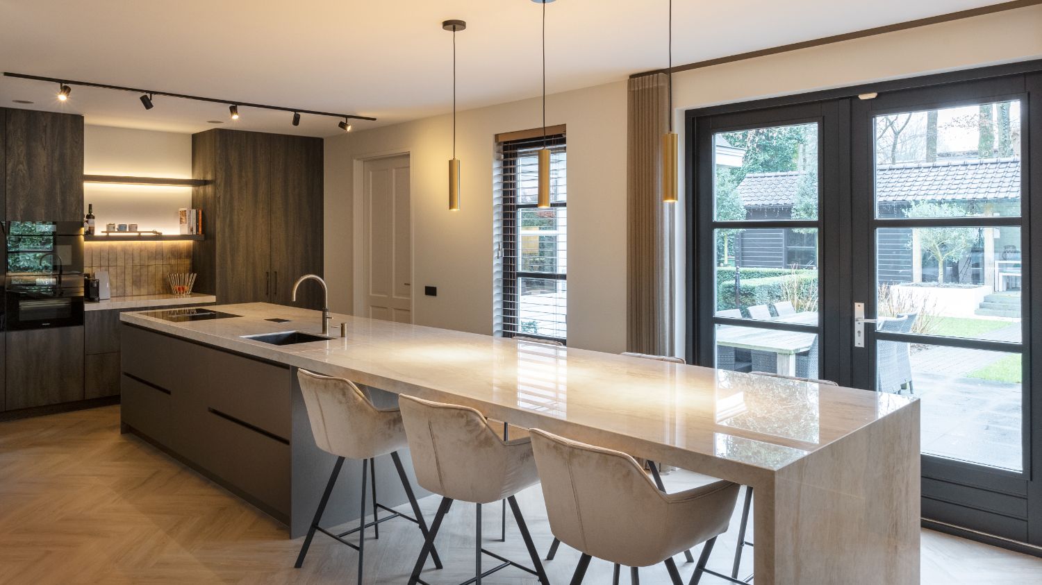 Om de luxe uitstraling van het bronzen eiland te bekrachtigen, is er gekozen voor een werkblad van Dekton in de kleur Arga. De glanzende finish van dit materiaal zorgt voor een prachtig spiegel effect, waardoor de keuken optisch nog groter lijkt. De subtiele aders en de natuurlijke tinten in het blad vormen een perfecte match met de warme bronskleur. Naast de esthetische waarde biedt Dekton het ultieme gebruiksgemak: het is nagenoeg onverwoestbaar en bestand tegen de dagelijkse dynamiek van een actieve keuken.