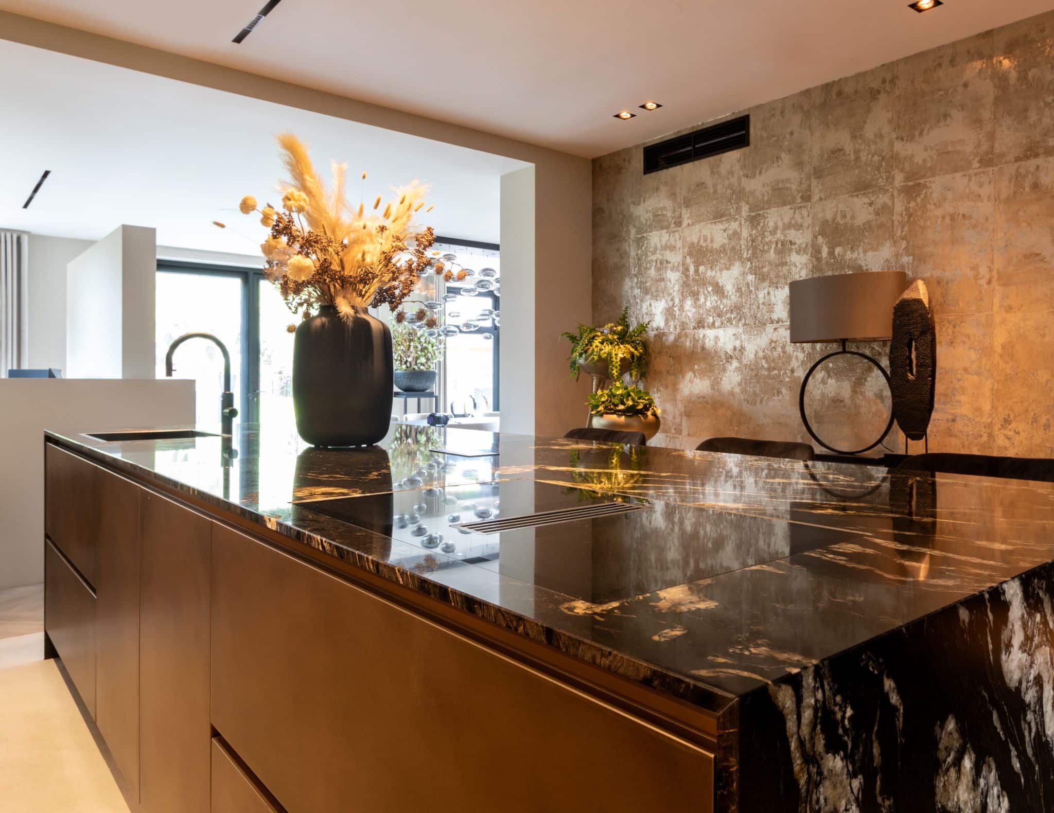 De keuken is voorzien van een zeer ruim eiland. De ladekasten onder het eiland zijn voorzien van gepatineerd brons. Dit betekent dat er door middel van zuren of verhitting een kunstmatige oxidatie plaatsvindt op het bronzen oppervlak. Dit geeft een prachtig effect. Na afloop van dit oxidatieproces is het gepatineerde brons voorzien van een laklaag.