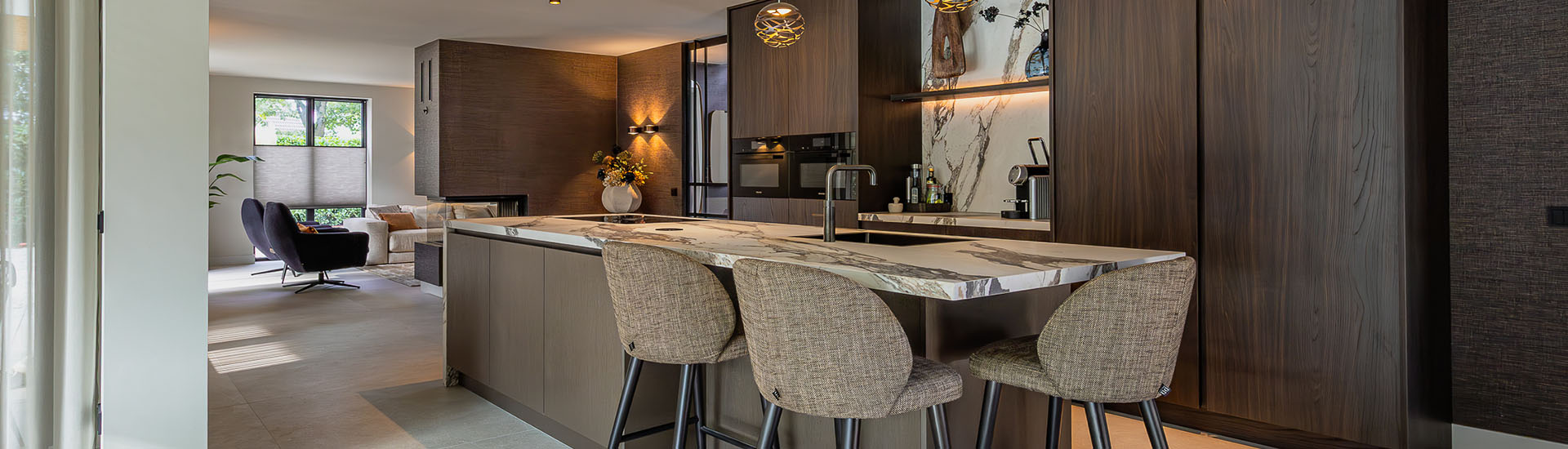 In deze woning komt alles samen in een keuken met kookeiland waar de sfeer van een luxe hotel centraal staat. Dit project laat zien dat een gedurfd ontwerp met donkere materialen juist voor rust en eenheid zorgt. De combinatie van het marmerlook keramiek en de warme, houten kasten maakt van deze keuken een stijlvol statement. Elk detail is met zorg gekozen om een plek te creëren waar comfort en design samenkomen.