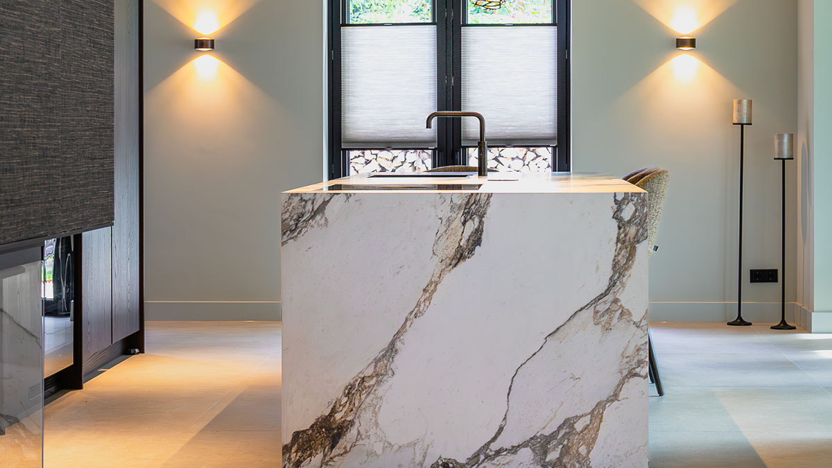 Deze keuken bewijst dat verschillende texturen een krachtig geheel kunnen vormen. De donkere houtnerven van de kastenwand contrasteren sterk met de lichte, levendige tekening van het keramische blad. De wandlampen en de design hanglamp boven het eiland werpen een zacht licht op de materialen, waardoor het luxe karakter extra wordt benadrukt. Hierdoor voelt de keuken niet alleen modern aan, maar ook warm en behaaglijk.