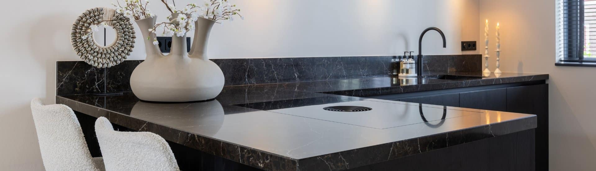 Moderne hoekkeuken in nieuwbouwwoning met zwart marmerlook werkblad