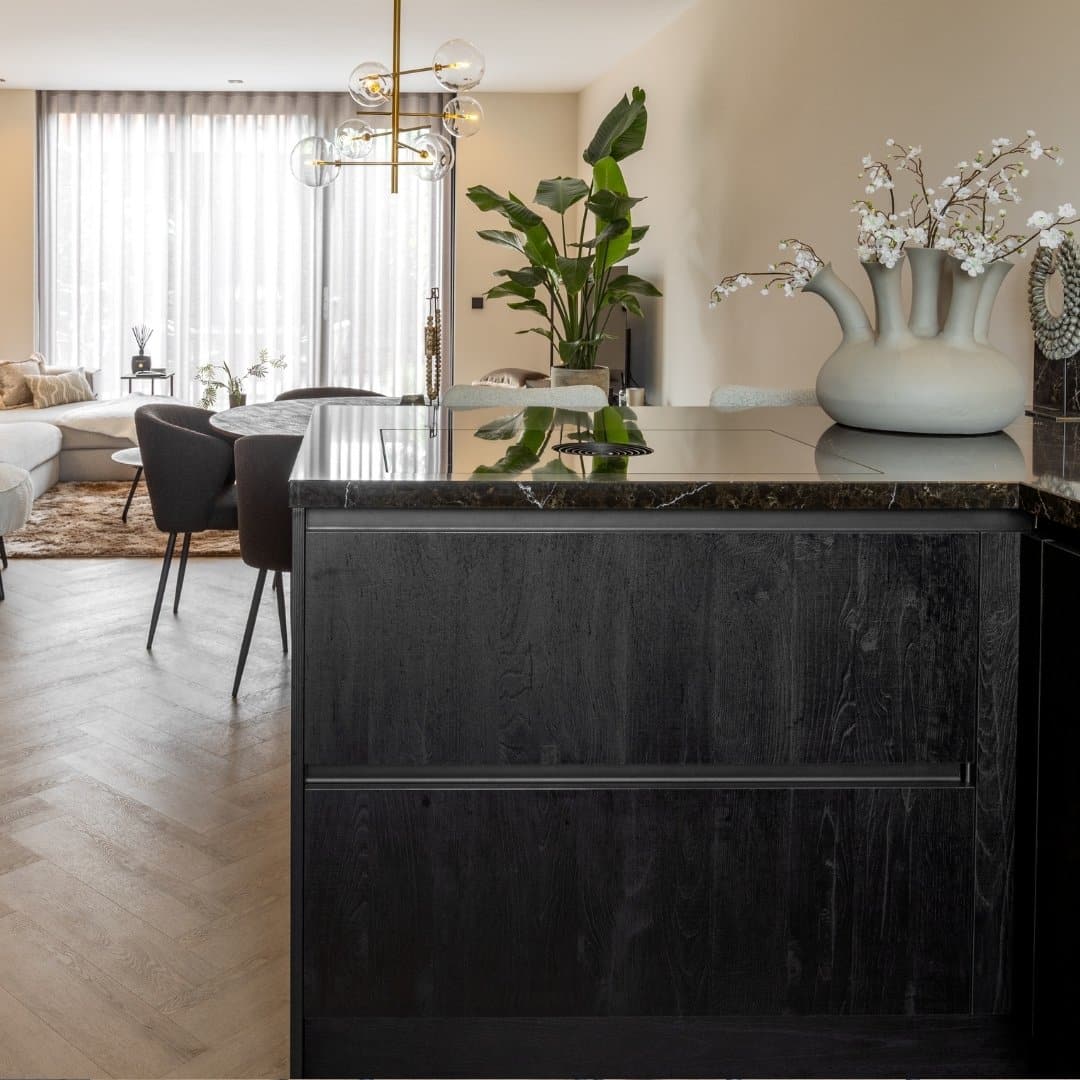 De zwarte accenten in deze keuken worden versterkt door de warme visgraatvloer en de subtiele verlichting. Dit zorgt voor een gebalanceerd geheel waarin kracht en sfeer samenkomen. Ondanks de donkere tinten voelt de keuken open en ruimtelijk aan. Dit komt door de slimme materiaalkeuze en de doordachte indeling. Deze moderne hoekkeuken laat zien dat zwart een stijlvolle en tijdloze keuze is.
