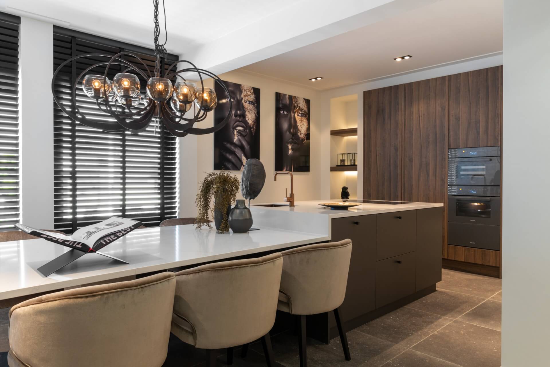 De Miele ovens hebben antraciet metallic fronten. Deze ovens zijn geweldig in gebruik, en zien er in combinatie met het noten donkere hout stijlvol uit. Naast de Miele apparatuur is er gekozen voor een Bora kookplaat uit de classic lijn. Deze kookplaat zuigt de kookdampen efficient naar beneden. In deze Barneveldse keuken wordt dan ook gekookt met een cleanrate van 100%.