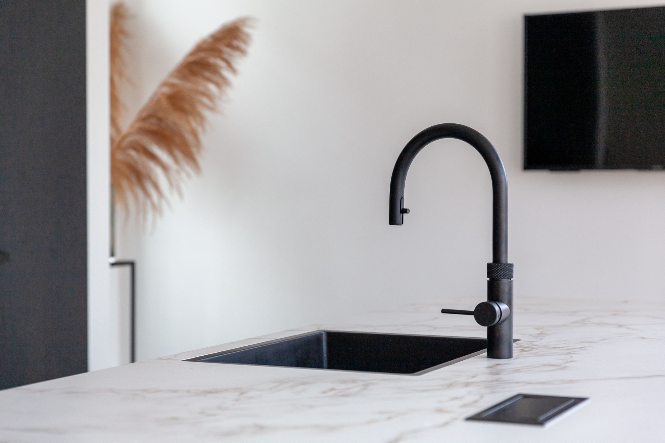 Groot, groter, grootst! Deze moderne keuken heeft een groot kookeiland van maar liefst 5,10m². Hierdoor is er genoeg ruimte om de meest complexe maaltijden te maken én is er genoeg ruimte om ook lekker te tafelen. Het kookeiland is voorzien van een gemarmerd dekton blad, een echte eyecatcher. De Quooker Flex en de Quooker Cube geven het kookeiland niet alleen de mogelijkheid om direct kokend water, maar ook bruisend water te schenken.