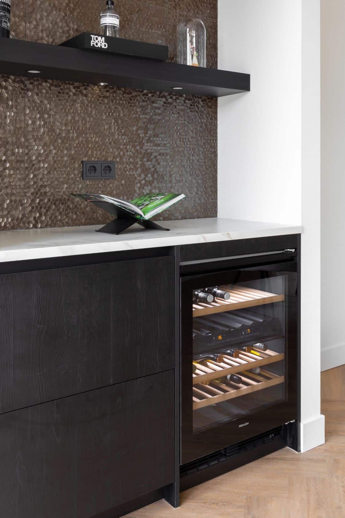 De keuken is voorzien van zwarte fronten met houtstructuur, wat het geheel een warme uitstraling geeft. De Miele apparaten uit de 7000 serie zorgen voor optimaal kookgenot en zijn mooi verwerkt in kastenwand. Naast de gebruikelijke oven en combimagnetron is er ook een klimaatkast voor wijn geplaatst, zodat uw mooiste wijnen altijd op hun best zijn.