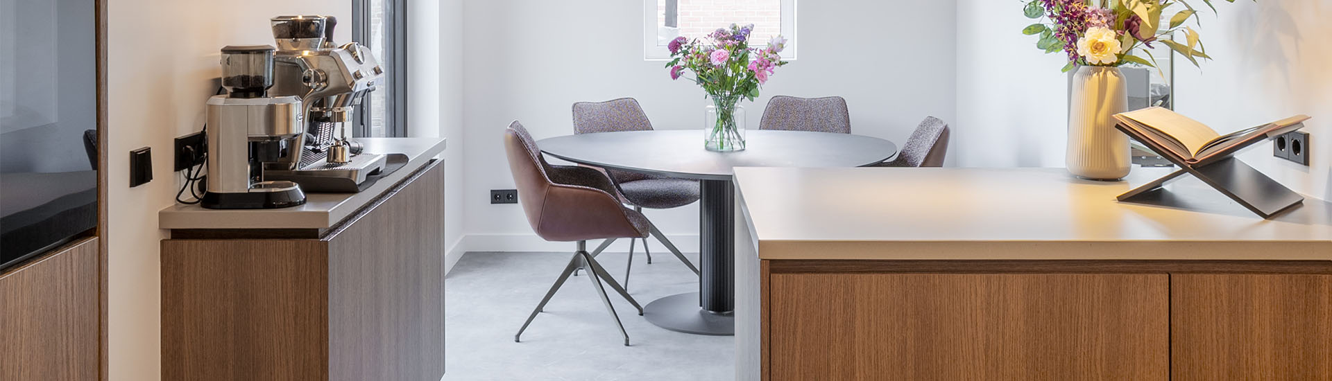 De kracht van deze keuken zit in de balans tussen het karaktervolle notenhout en het rustige werkblad. Deze combinatie leent zich uitstekend voor een minimalistische setting, maar komt net zo goed tot zijn recht in een klassiek interieur. Het lichte blad vormt een kalm tegenwicht voor de diepe, warme kleur van het walnoothout. Of de keuze nu valt op een volledig houten opstelling of subtiele details: de mix van texturen voegt altijd karakter toe zonder de rust in huis te verstoren.
