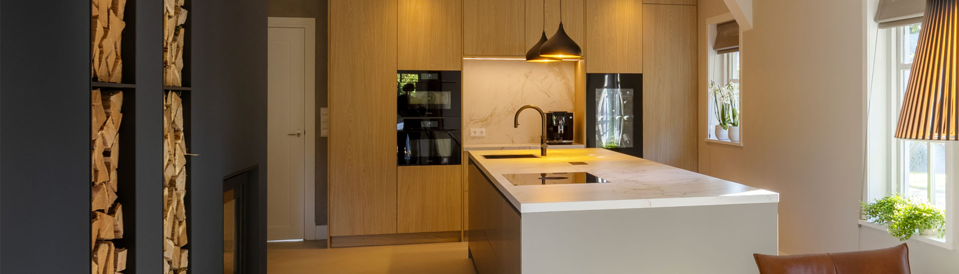 Wat direct opvalt aan deze keuken is het greeploze kookeiland in een warme champagnekleur. Het eiland vormt het hart van de ruimte en zorgt voor een rustige, luxe uitstraling. De hoge kastenwand in natuurlijk eiken brengt balans en voegt een tastbare warmte toe aan het geheel. Het Dekton Entzo werkblad verbindt alle kleuren op een subtiele manier en geeft de keuken een verfijnde, natuurlijke uitstraling.Â